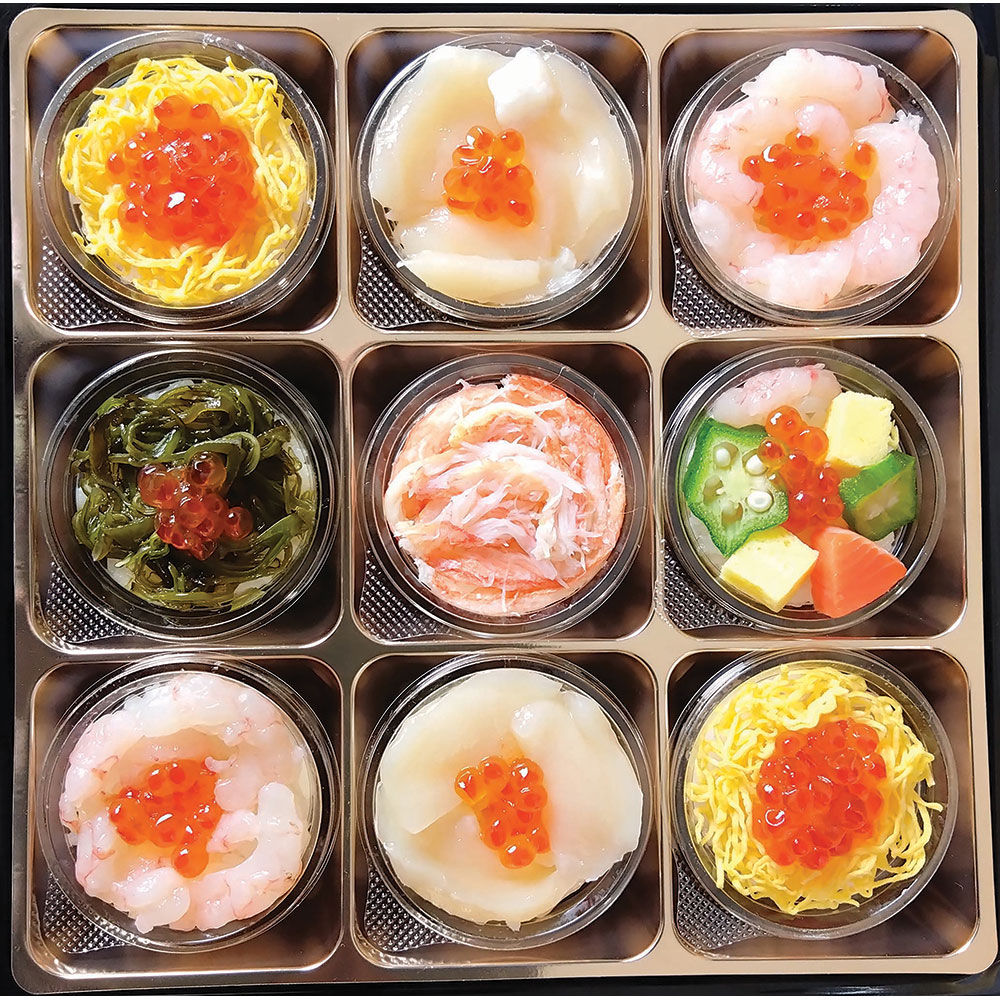 プチいくら丼40g×2、プチ甘えび丼40g×2、プチほたて丼40g×2、プチめかぶ丼40g×1、プチかに丼40g×1、プチ彩り丼40g×1