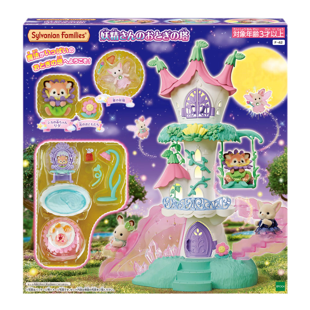 蜜の妖精と花のおともだちが住んでいるおとぎの塔、お花テーマの家具、シカの赤ちゃんのセットです。