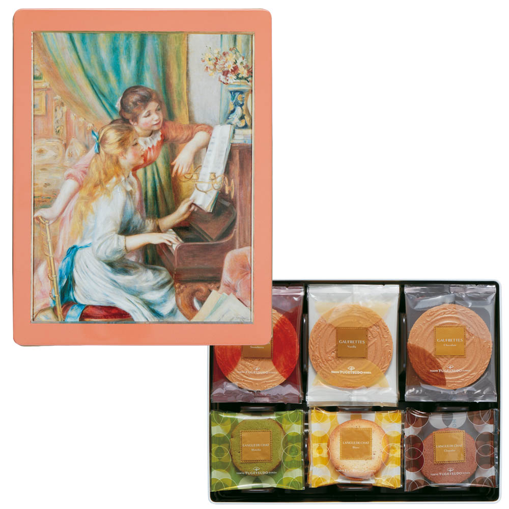 ゴーフレット(バニラ・チョコレート・ストロベリー×各7)、ラングドシャ(ホワイト・抹茶・チョコレート×各5) 缶サイズ:縦約25.8cm×横約19.8cm×高さ約7.0cm