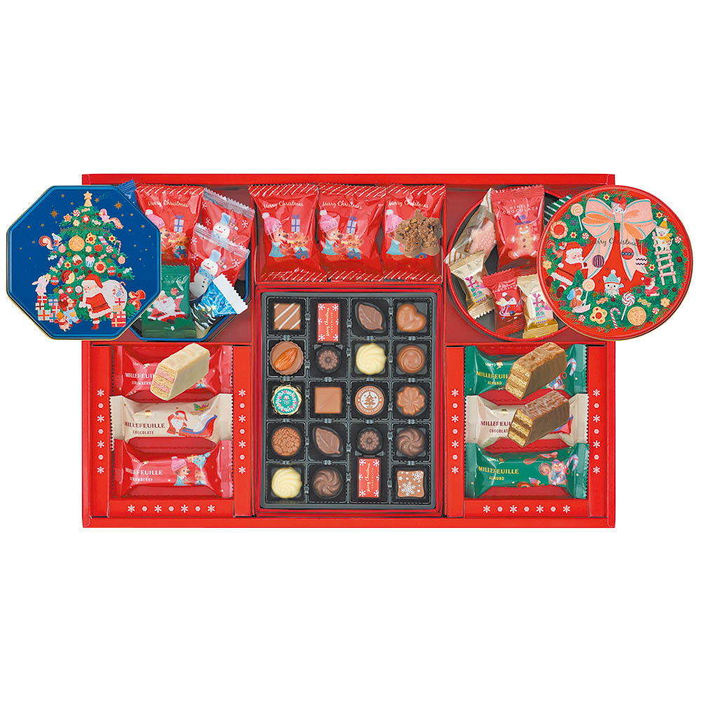 クリスマスファンシーチョコレート×20、チョコレート 33g、チョコレート菓子・クッキー×各3、マシュマロ×2、ミルフィーユ×6、星型クランチチョコレート×3