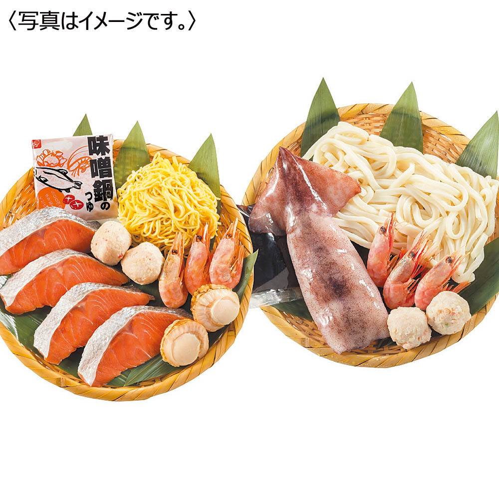 甘えび 3尾×2、えび入つみれ×2、いか 100g、うどん 250g、えび魚醤油入たれ 50ml、鮭切身×4、帆立×2、かに入つみれ×2、ラーメン 80g、みそたれ 50g