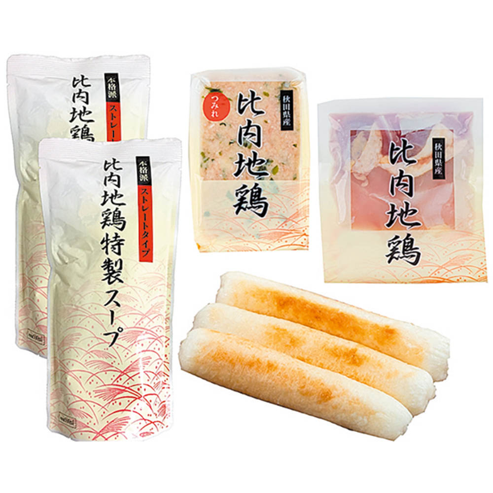 きりたんぽ 3本、比内地鶏肉・比内地鶏つみれ 各100g、比内地鶏ストレートスープ 500ml×2