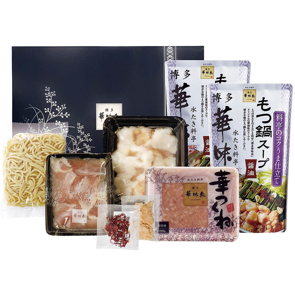 もつ鍋スープ 600g×2、牛小腸 200g、鶏はらみ 100g、華つくね 200g、ちゃんぽん麺 150g、にんにくスライス 5g、唐辛子 1g