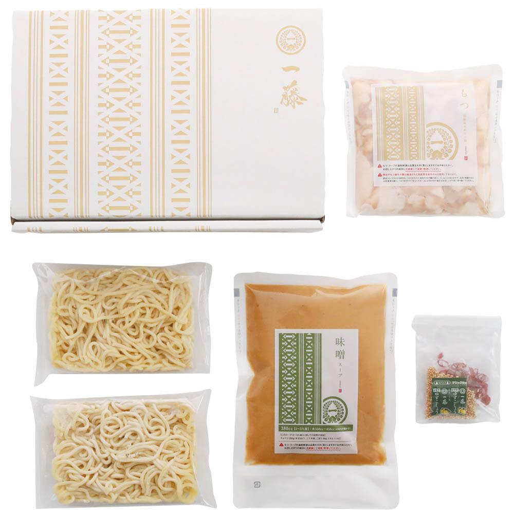 もつ鍋濃縮スープ(味噌味) 380g、牛小腸 300g、ゆでちゃんぽん 200g×2、薬味(ごま、唐辛子、柚子こしょう) 各5g