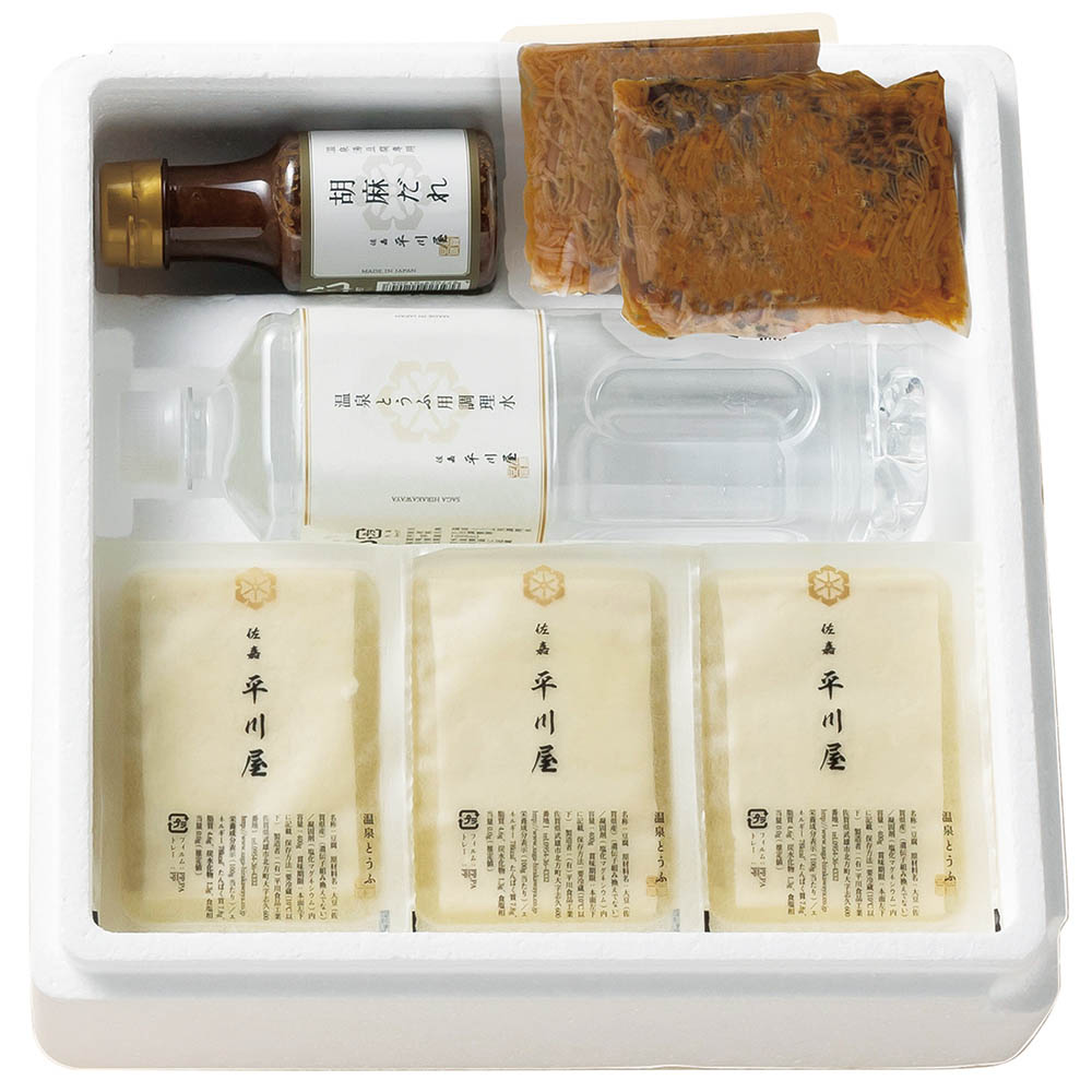温泉とうふ 400g×3、温泉とうふ用調理水 1000ml、胡麻だれ 150ml、雑炊用きのこ具材 40g×2