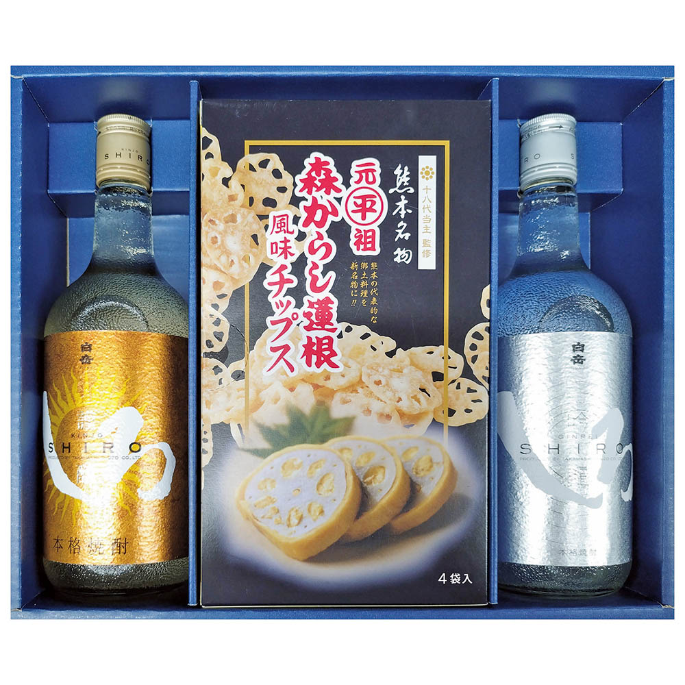 白岳 謹醸しろ(金しろ) 25度 720ml、白岳 吟麗しろ(銀しろ) 25度 720ml、森からし蓮根風味チップス(箱) 20g×4