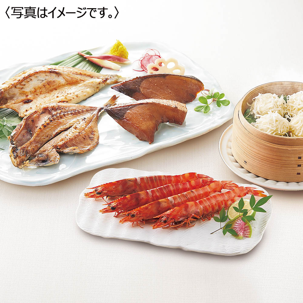かます干物・あじ干物・あじみりん干・ぶり醤油みりん漬×各2、車海老(養殖)・いか入りしゅうまい×各4、連子鯛干物