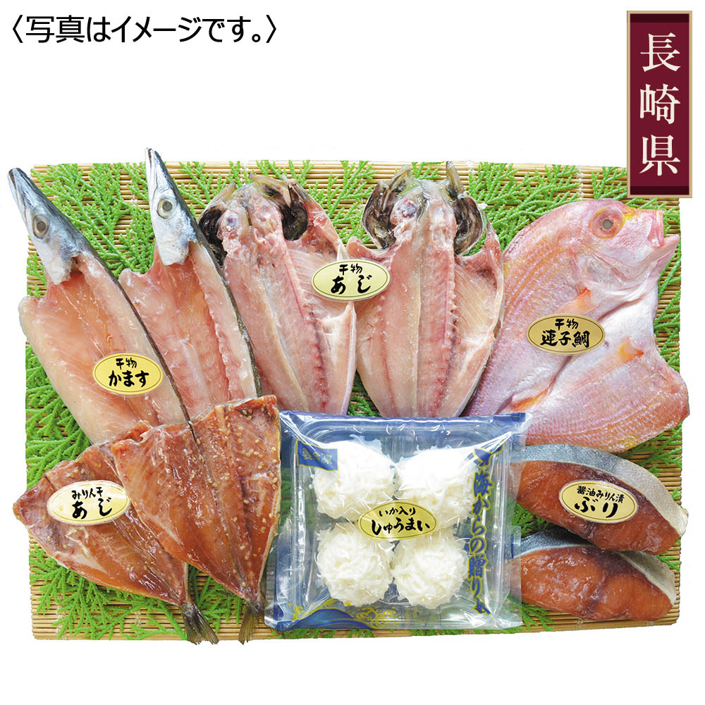 かます干物・あじ干物・あじみりん干・ぶり醤油みりん漬×各2、いか入りしゅうまい×4、連子鯛干物