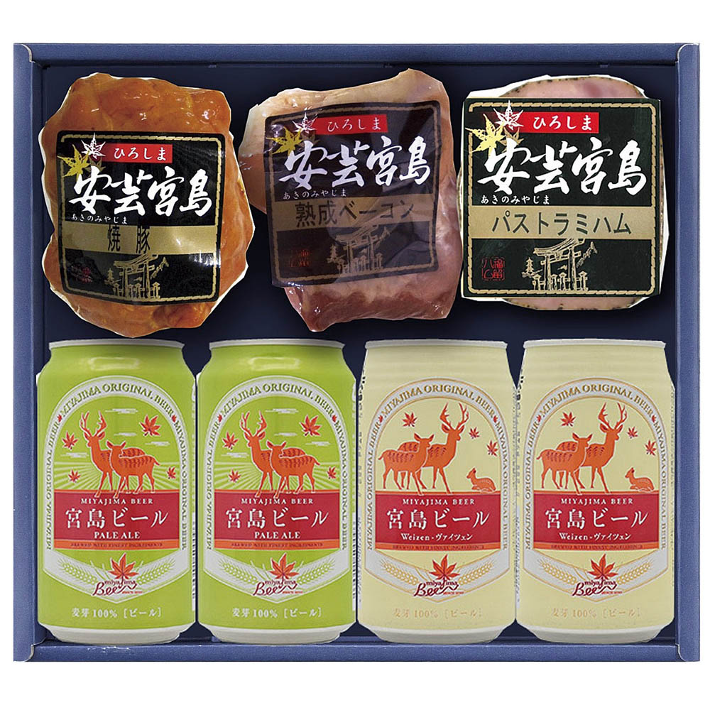 宮島ビールヴァイツェン 350ml×2、ペールエール 330ml×2、福留ハム熟成ベーコン 130g、パストラミハム・焼豚 各190g