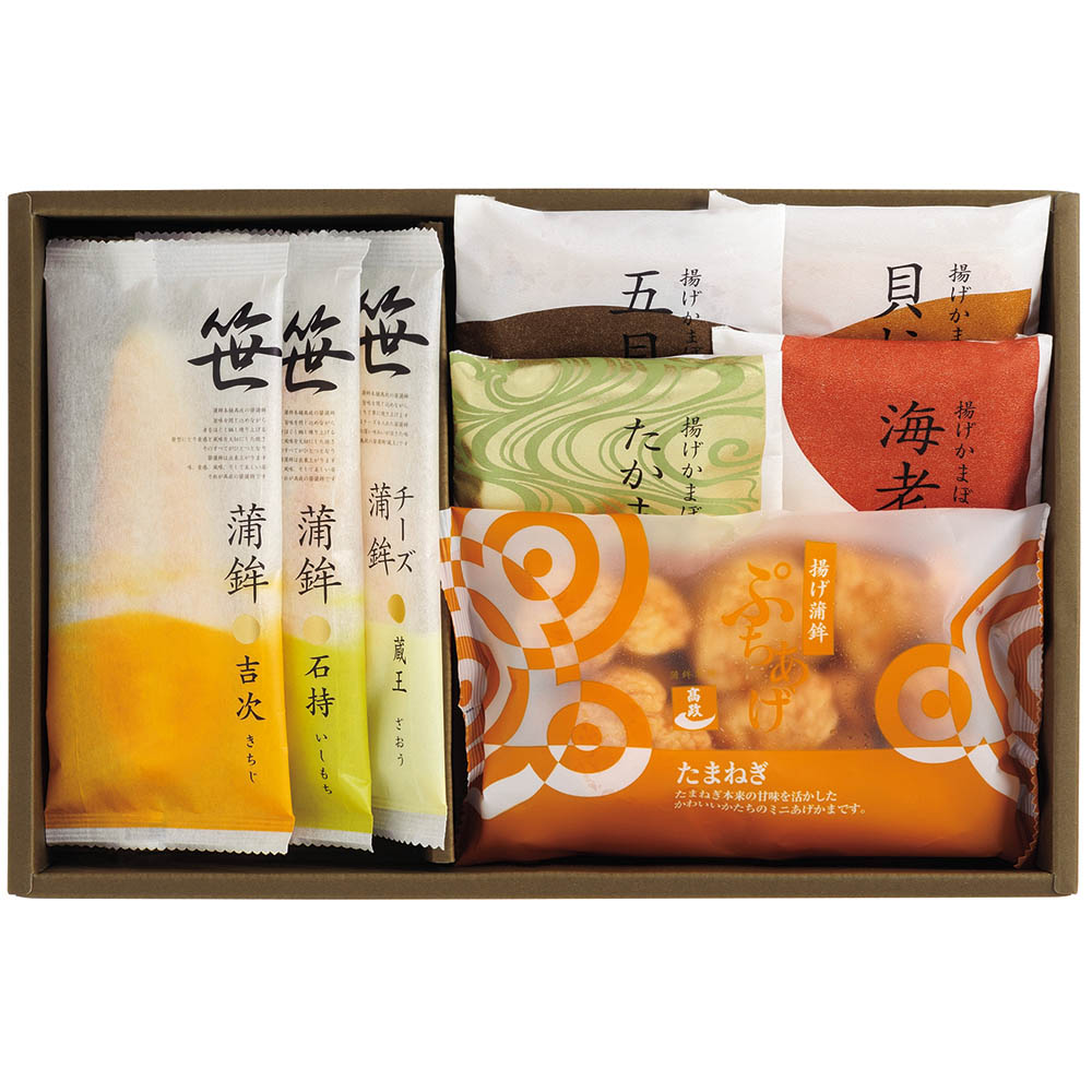 笹かまぼこ(吉次、石持)、チーズ笹かまぼこ蔵王、揚げかまぼこ(たかまさ、五目、海老、貝柱)、ぷちあげたまねぎ