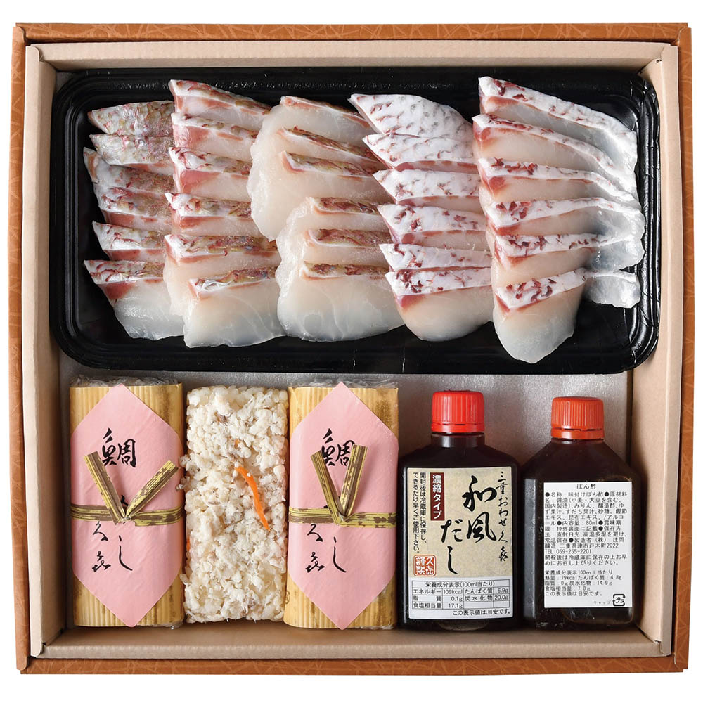 鯛薄造り 250g、鯛めし 70g×3、濃縮鍋だし・ポン酢 各80ml