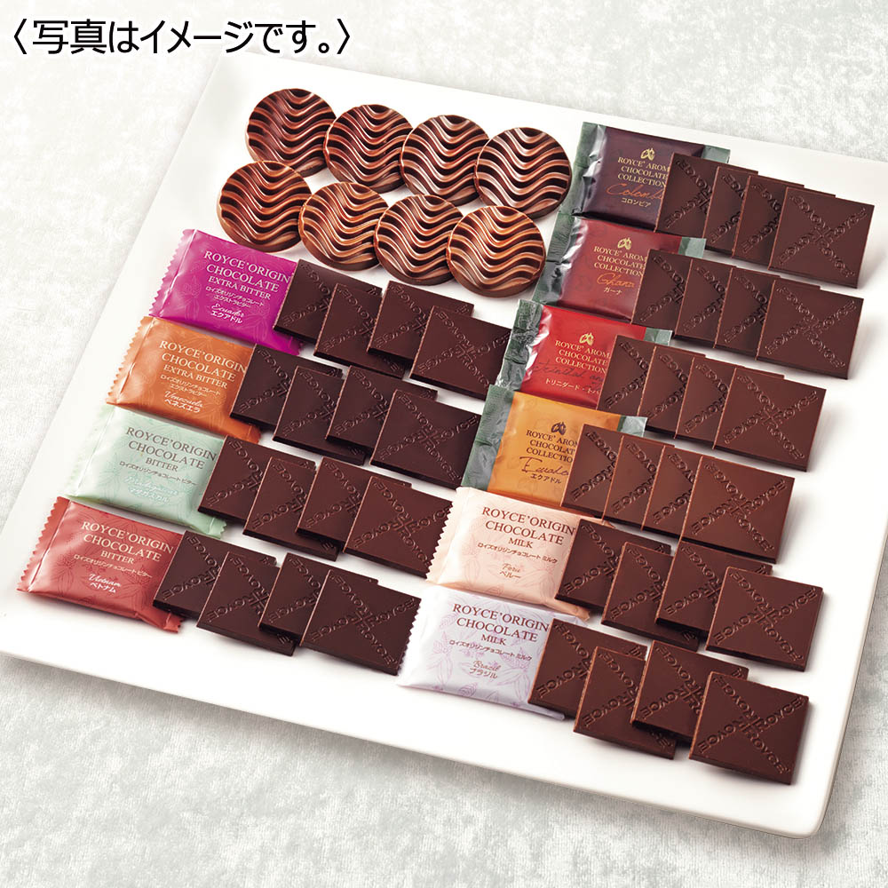ロイズアロマチョコレートコレクション[エクアドル・ガーナ・コロンビア・トリニダード トバゴ]×各5、ロイズオリジンチョコレート[エクストラビター(エクアドル・ベネズエラ)]×各5、[ビター(ベトナム・マダガスカル)]×各5、[ミルク(ブラジル・ペルー)]×各5、ピュアチョコレート[スイート・フルーティミルク]×各4 直射日光・高温多湿を避け、25度以下で保存