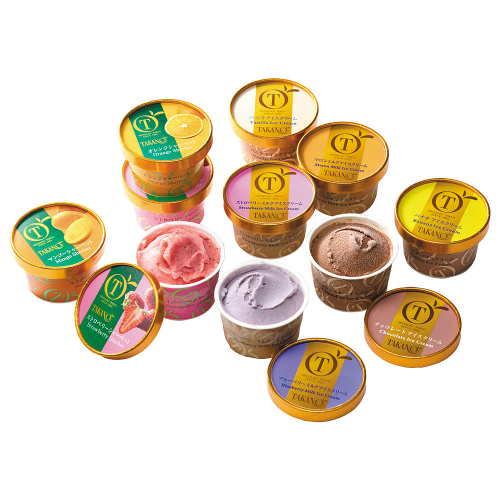 シャーベット(ストロベリー×2、オレンジ、マンゴー)、アイスクリーム(ストロベリーミルク、ブルーベリーミルク、マロンミルク、バナナ、バニラ、チョコレート)
