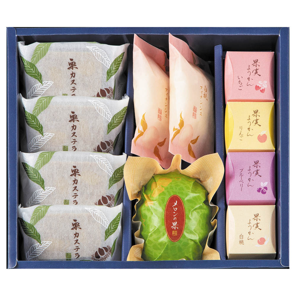 栗カステラ×4、白桃フィナンシェ×2、果実ようかん(白桃、りんご、いちご、ブルーベリー)、メロンの果