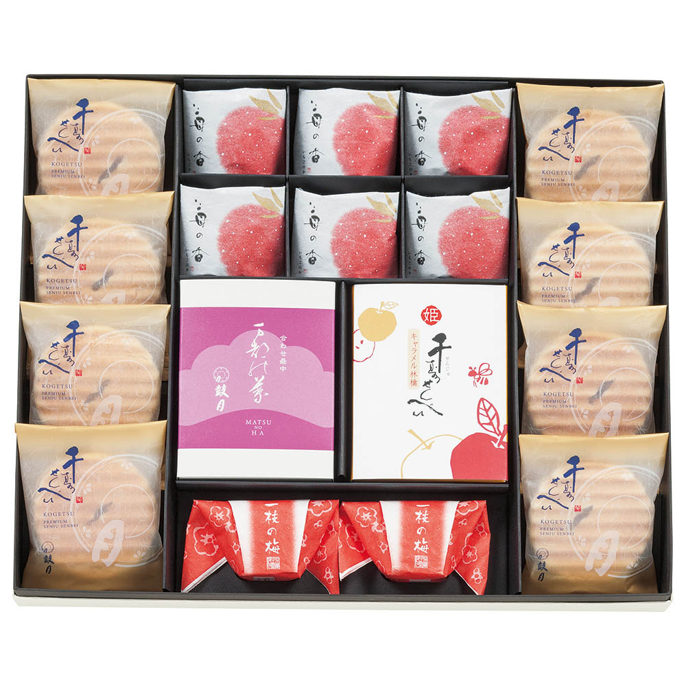 プレミアム千寿せんべい×8、一枝の梅・万都の葉×各2、苺の香×6、姫千寿せんべいキャラメル林檎×4