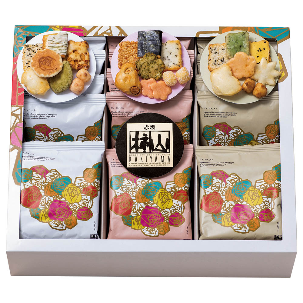 ななこ壱(慶長しぶき海苔、短冊昆布巻、小角豆柿、古乃端海老、ひとえ葉抹茶、玉子煎餅、梅あられ)×8、ななこ弐(慶長セサミ、小角バジル、小角海苔チーズ、古乃端オニオン、丸花海老、角花昆布だし、黒糖あられ)×8、ななこ参(慶長醤油、短冊海苔巻、小角昆布、古乃端アーモンド、丸花青海苔、小花かつおだし、ざらめあられ)×9
