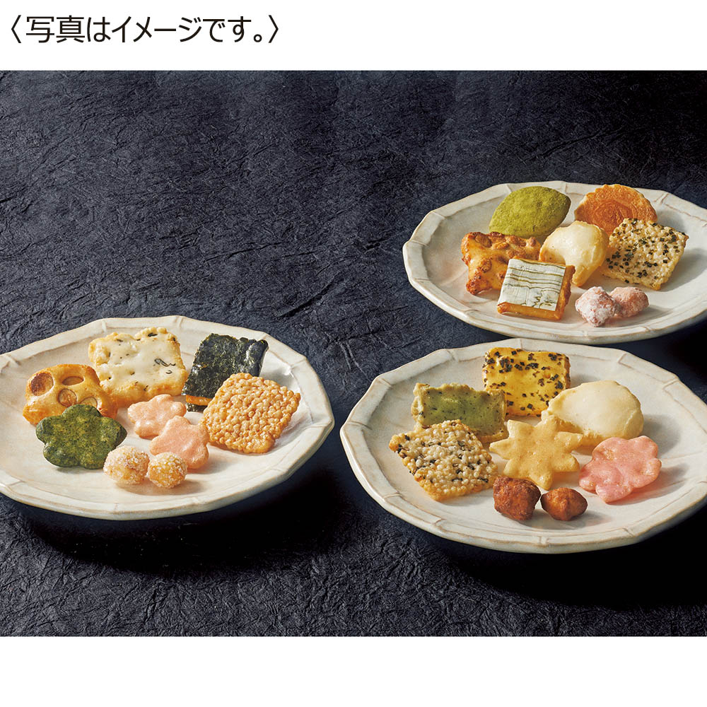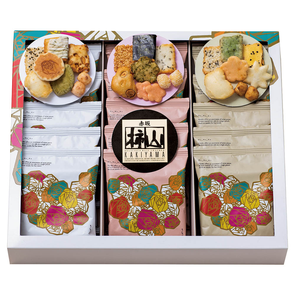 ななこ壱(慶長しぶき海苔、短冊昆布巻、小角豆柿、古乃端海老、ひとえ葉抹茶、玉子煎餅、梅あられ)×5、ななこ弐(慶長セサミ、小角バジル、小角海苔チーズ、古乃端オニオン、丸花海老、角花昆布だし、黒糖あられ)×5、ななこ参(慶長醤油、短冊海苔巻、小角昆布、古乃端アーモンド、丸花青海苔、小花かつおだし、ざらめあられ)×5