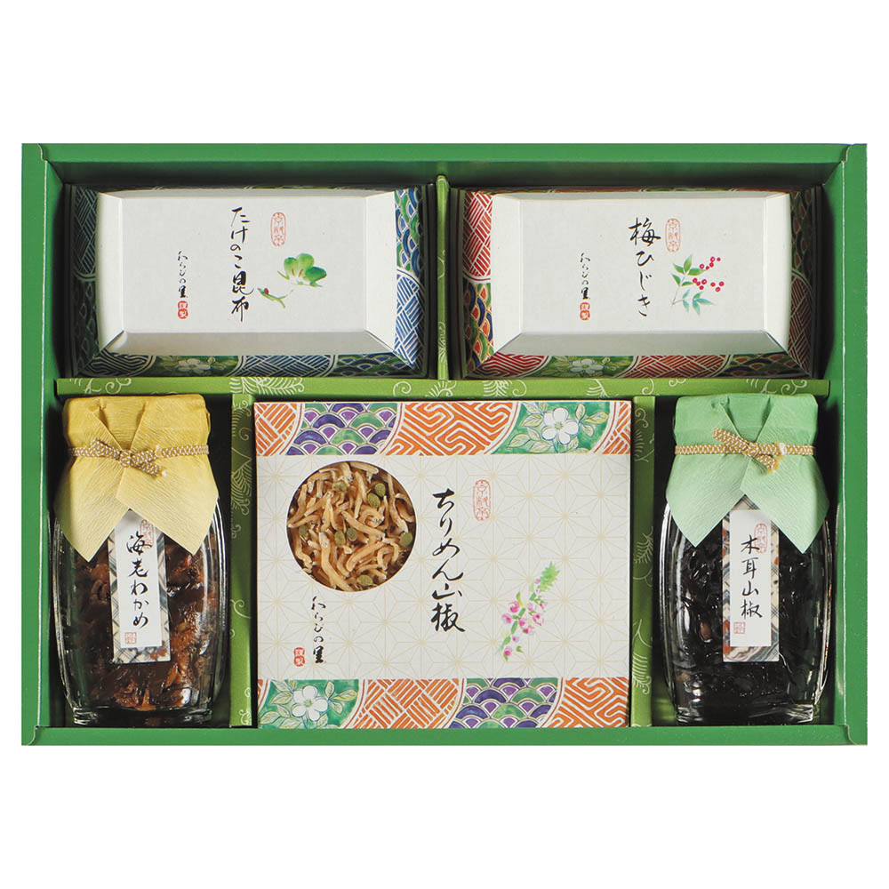 ちりめん山椒 40g、海老わかめ 65g、木耳山椒 55g、たけのこ昆布・梅ひじき 各50g