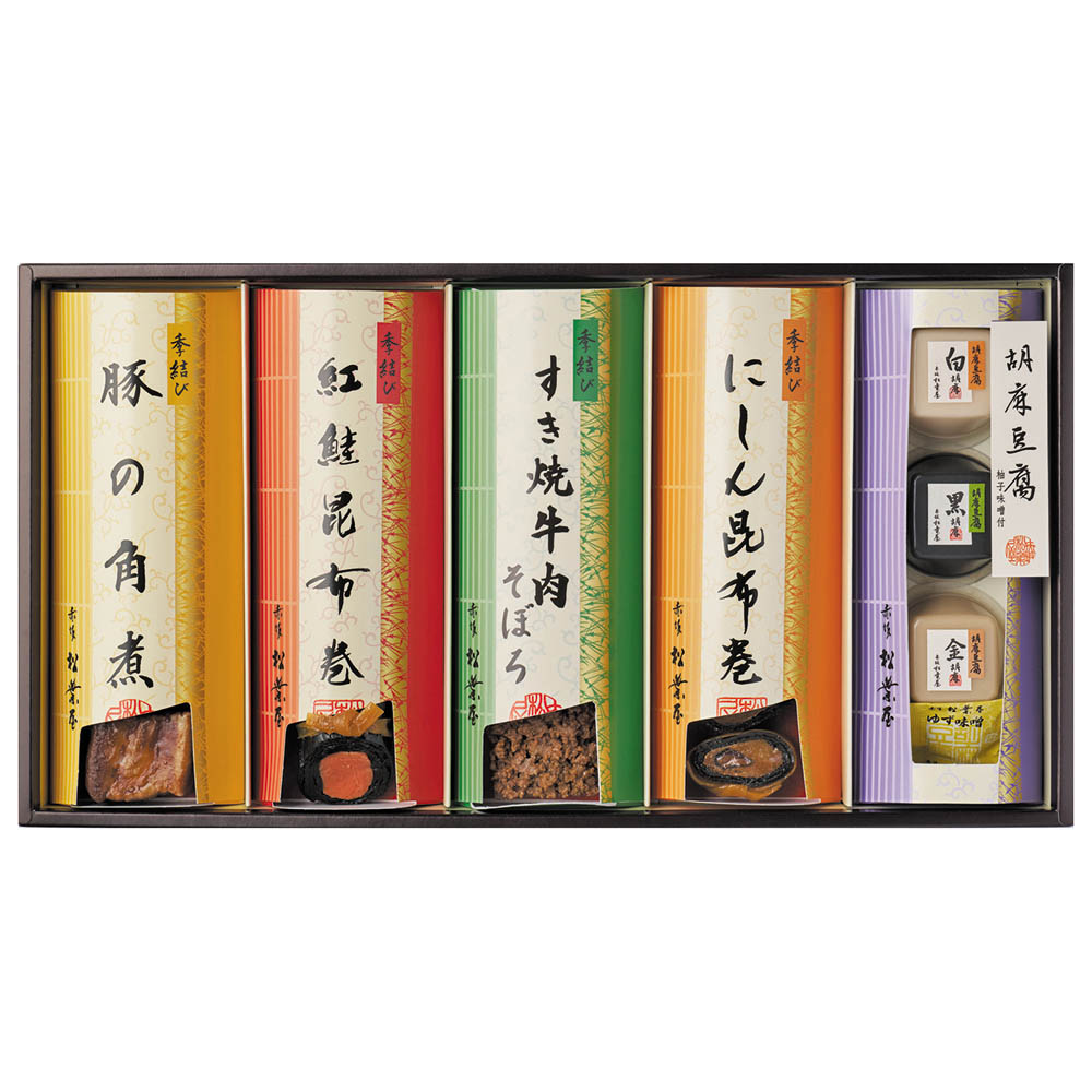 すき焼牛肉そぼろ・紅鮭昆布巻・にしん昆布巻 各80g、豚の角煮 100g、胡麻豆腐(白・黒・金 各43g、柚子味噌たれ 7g×3)