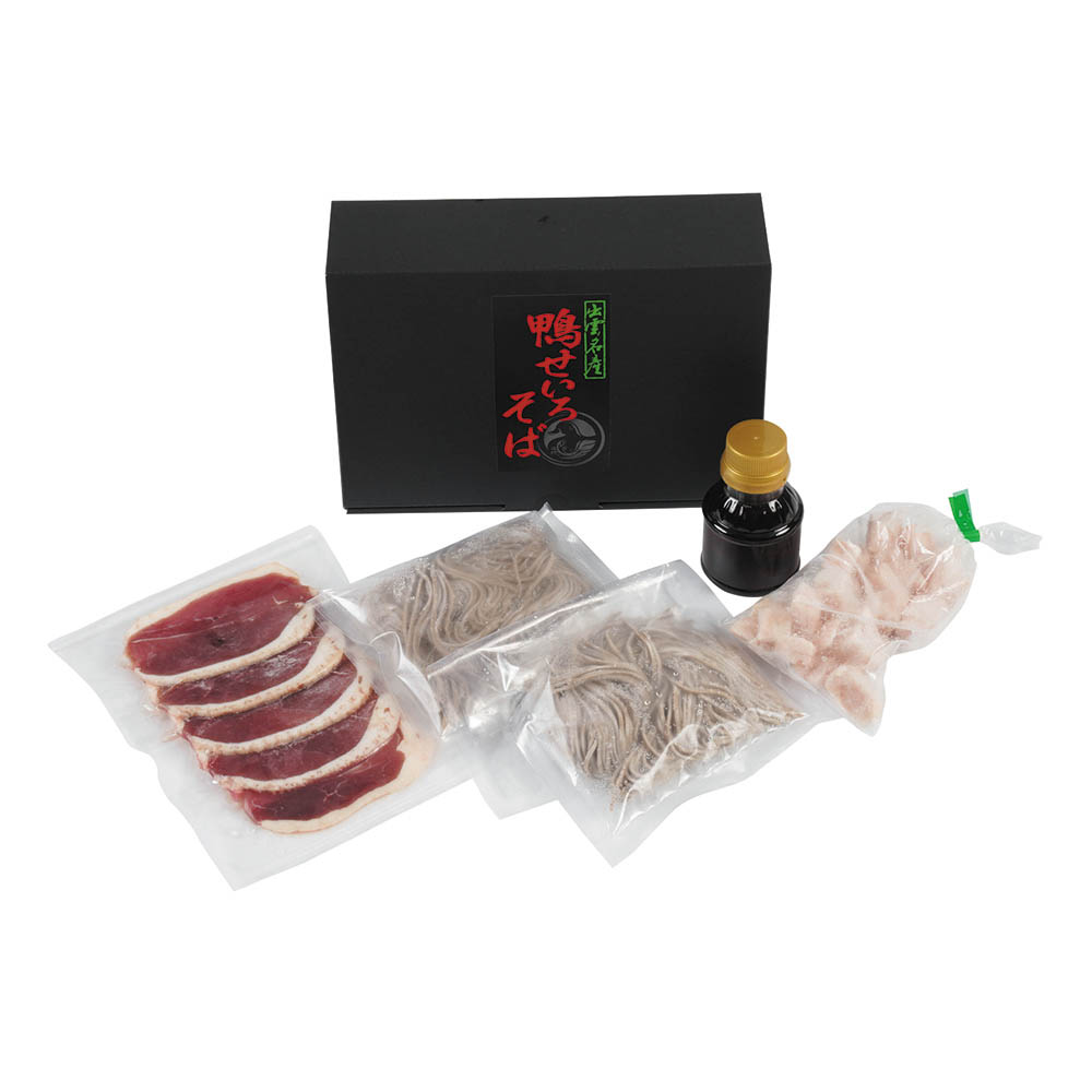 出雲生そば 110g×2、しいたけだし醤油 100ml、鴨皮 100g、本鴨ロース肉 100g