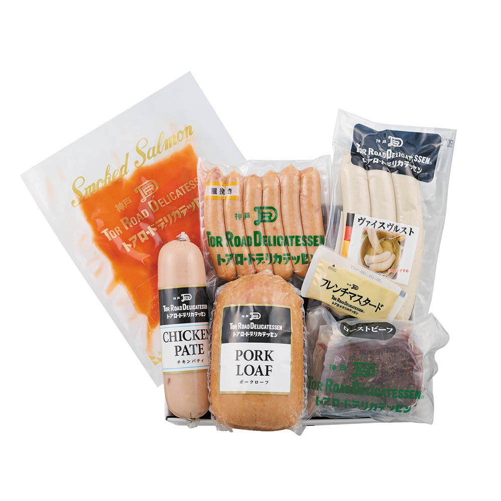 サーモン 35g、ローストビーフ 130g、ヴルスト 180g、ポークローフ 500g、パティ 200g、粗挽ウィンナー 125g、フレンチマスタード 10g