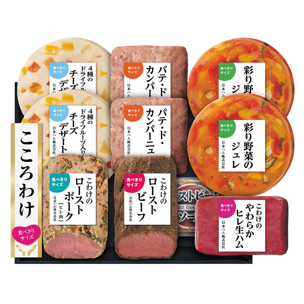 こわけのローストビーフ・こわけのローストポーク(ヒレ肉)・こわけのやわらかヒレ生ハム 各100g、ローストビーフソース 20g、4種のドライフルーツ入りチーズデザート・彩り野菜のジュレ 各100g×2、パテ・ド・カンパーニュ 100g×2