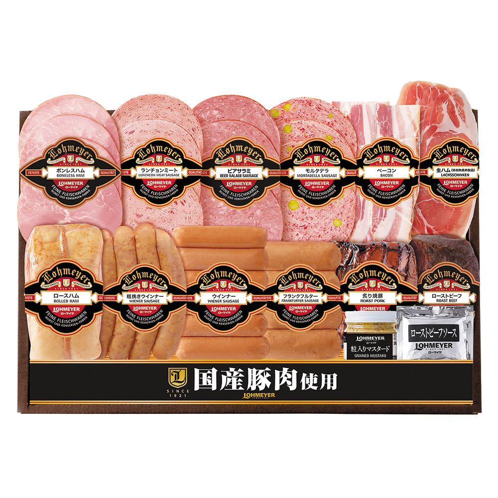ボンレスハムスライス 50g、ランチョンミートスライス 60g、ビアサラミスライス 60g、モルタデラスライス 60g、ベーコンスライス 50g、生ハム 55g、ロースハム 280g、粗挽きウインナー 100g、ウインナー 110g、フランクフルター 120g、炙り焼豚190g、ローストビーフ150g、粒マスタード80g、ローストビーフソース20g