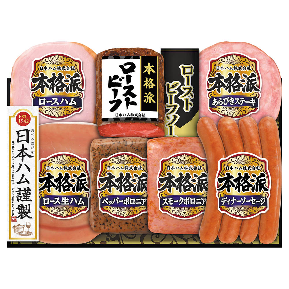 ローストビーフ 140g、ローストビーフソース 40g、ロースハム 160g、あらびきステーキ 72g、ロース生ハム 27g、ペッパーボロニア・スモークボロニア 各105g、ディナーソーセージ 132g