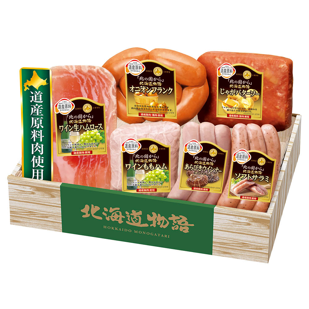 ワインももハム 130g、ワイン生ハムロース 35g、じゃがバターソー・オニオンフランク 各180g、ソフトサラミ・あらびきウインナー 各75g