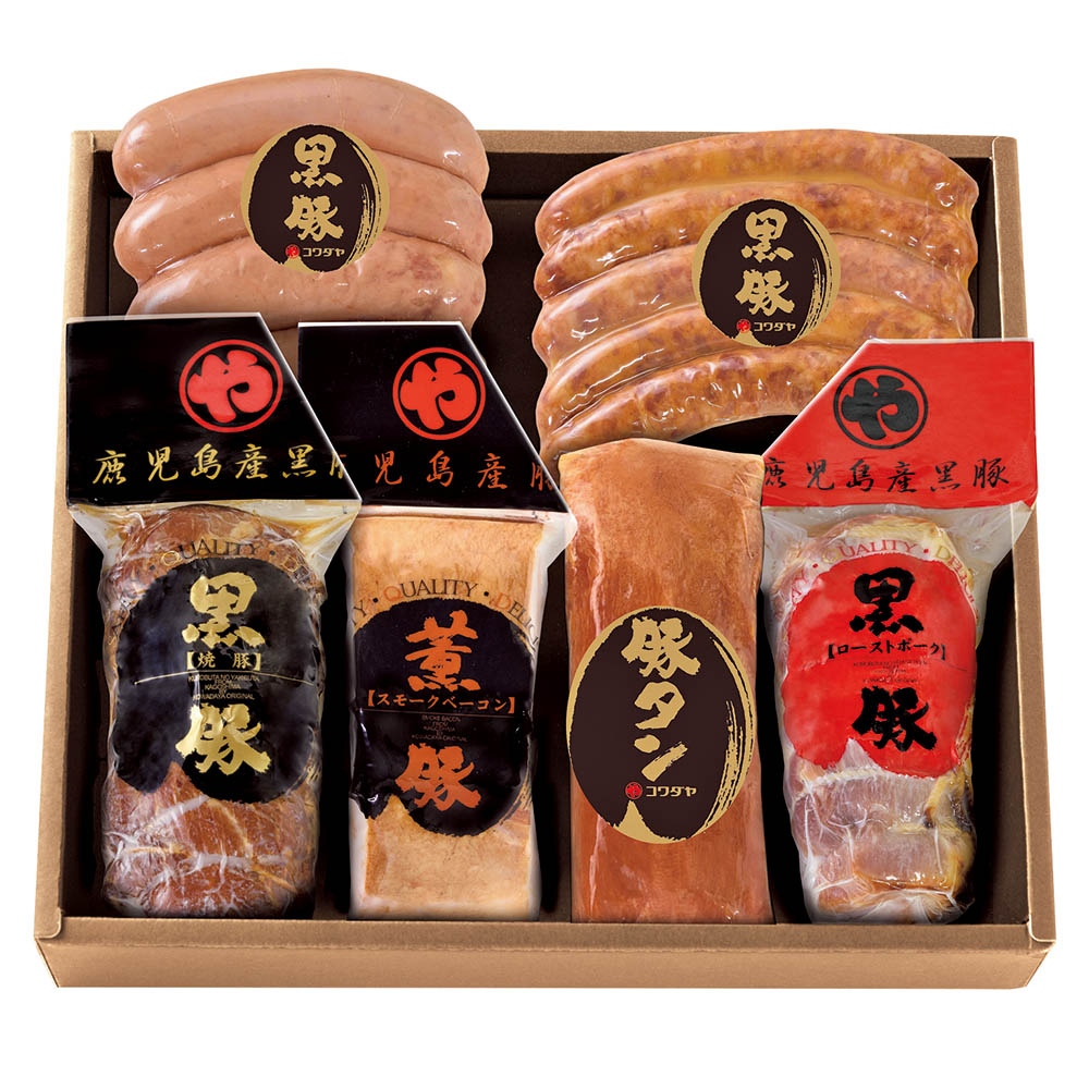 黒豚焼豚・黒豚ベーコン・黒豚ローストポーク 各220g、スモーク豚タン 230g、黒豚フランク 320g、黒豚チョリソー 250g