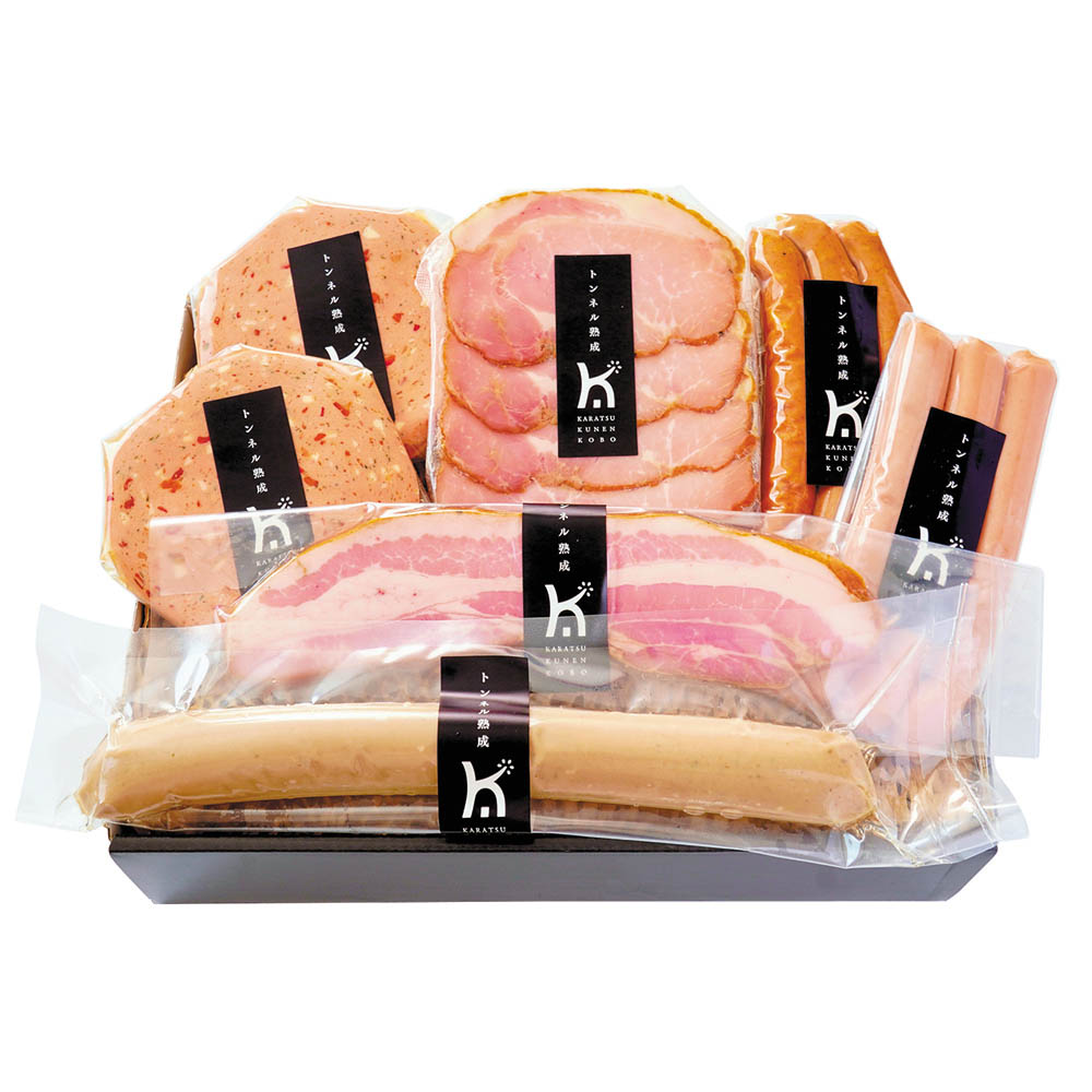 ロースハムスライス 55g、ベーコン 45g、リヨナーステーキ(トマト&チーズ)60g×2、ボックヴルスト・あらびきウインナー 各93g、ドイツ屋台の白い焼きソーセージ 100g