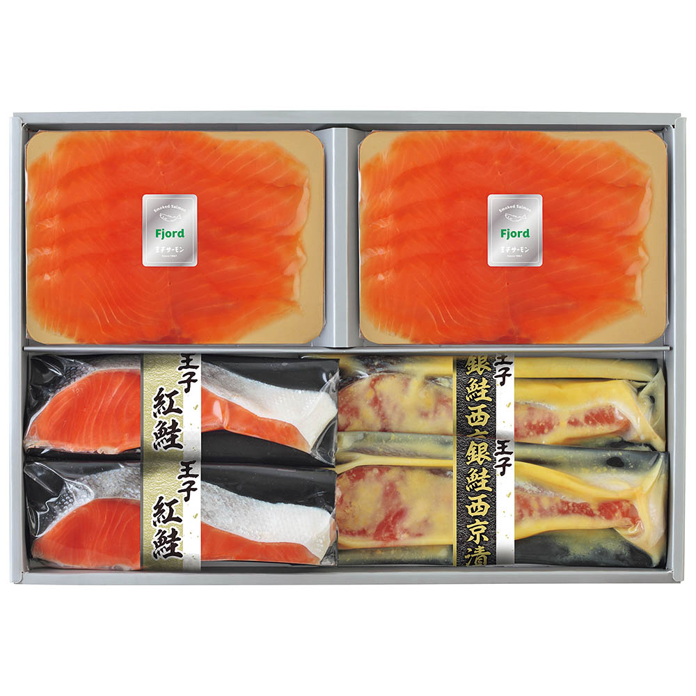 フィヨルドサーモンスライス 50g×2、銀鮭西京漬・紅鮭切身 各60g×2