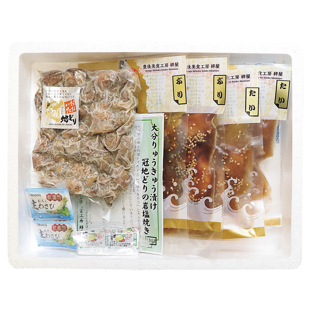 冠地どり岩塩焼き 170g、真鯛りゅうきゅう・ぶりりゅうきゅう 各70g×2、わさび 2.5g×4、柚子胡椒 2g×2