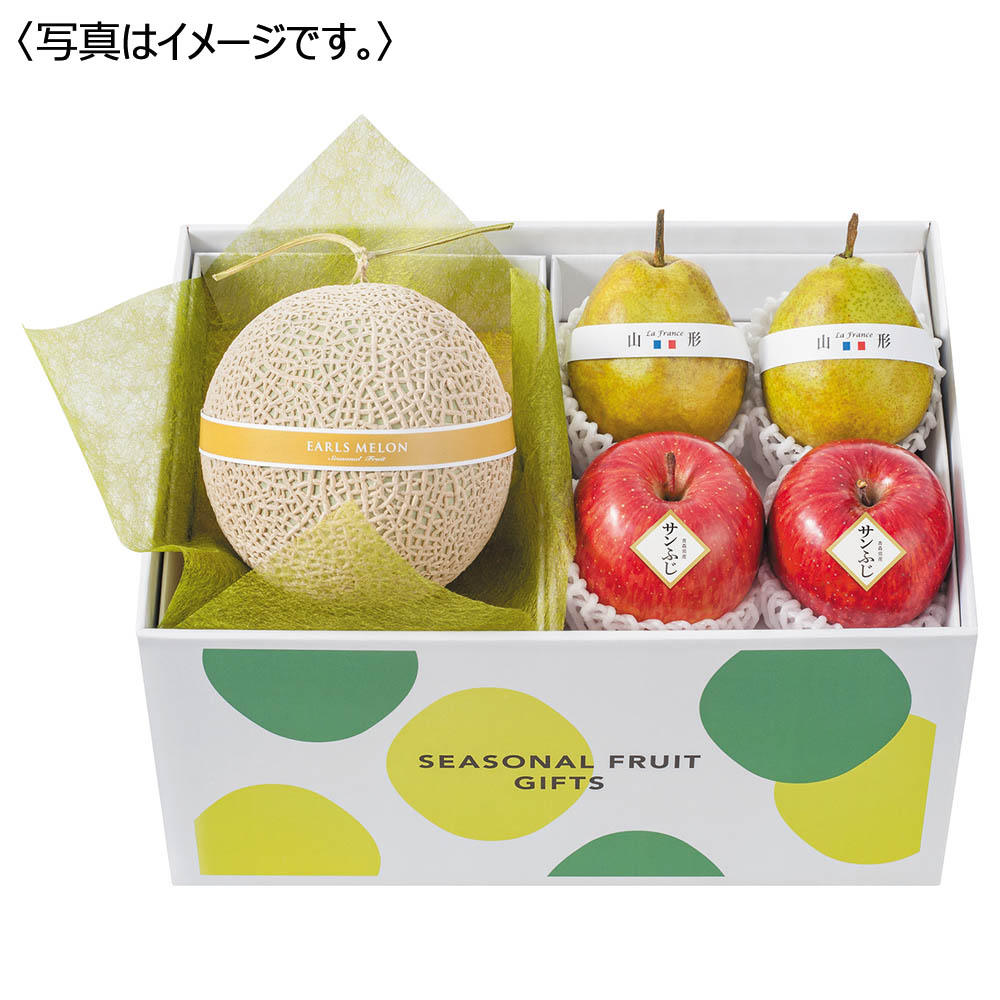 アールスメロン(熊本県または長崎県産) 約1.3kg、ラ・フランス(山形県産) 約250g×2玉、サンふじ(青森県産) 約250g×2玉
