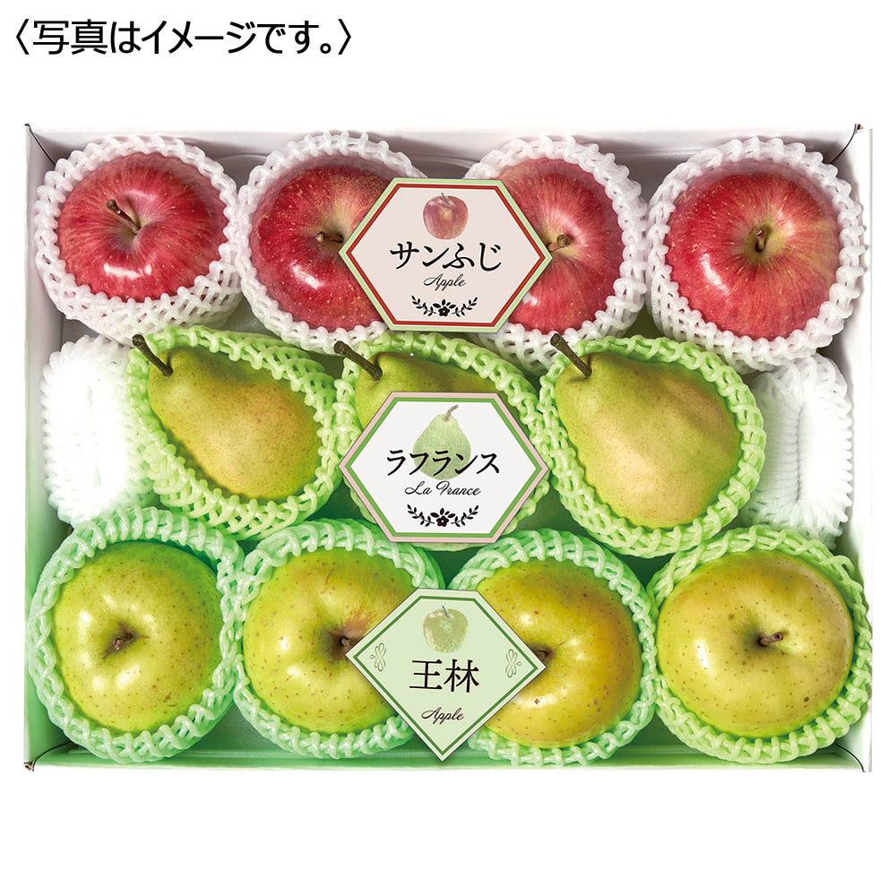 サンふじりんご 約250g×4個(青森県又は岩手県産)、ラ・フランス 約270g×3個(山形県産)、王林 約250g×4個(青森県又は岩手県又は長野県産)