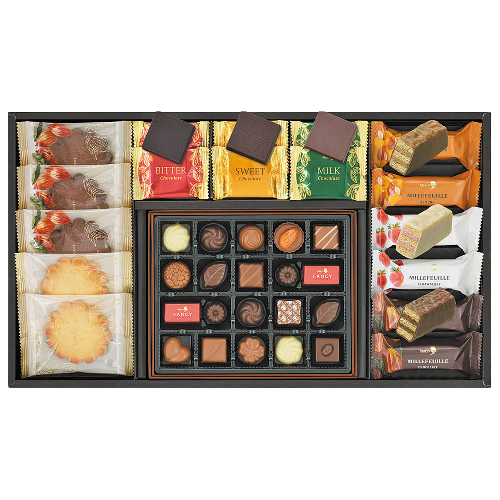 ファンシーチョコレート×20、ミルフィーユ×6、プレーンチョコレート×6、クッキー×5