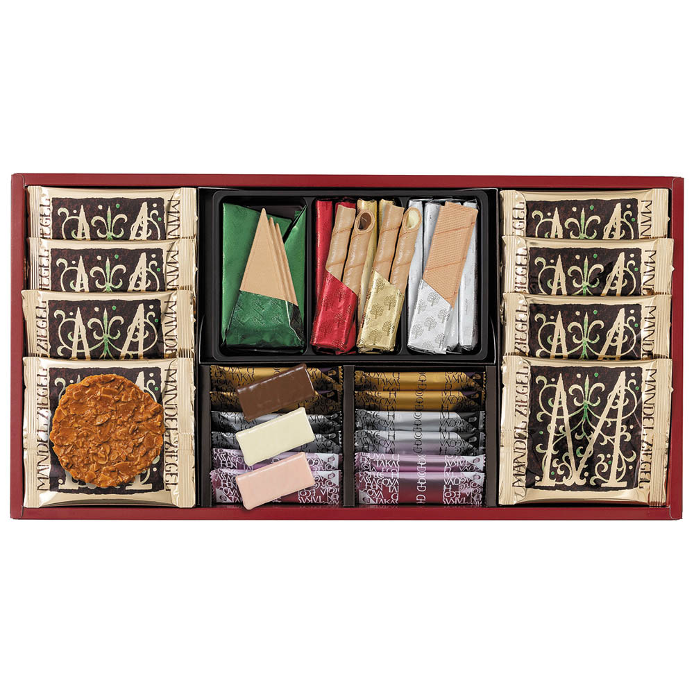 エコルセ×28、マンデルチーゲル×8、ショコラエコルセ(ミルクチョコ・ホワイトチョコ・ストロベリーチョコ×各4)