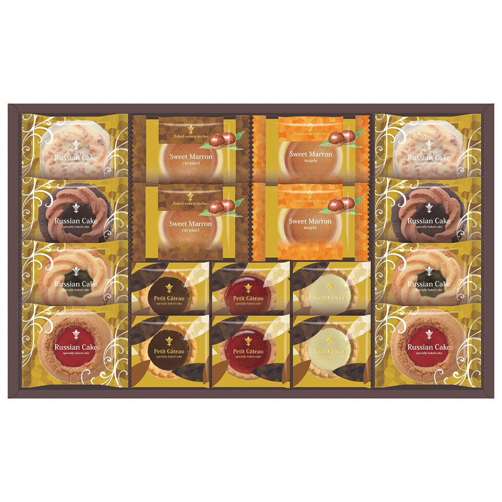 スイートマロン(キャラメル・メープル)×各2、プチガトー(ストロベリー・ホワイトチョコ・ミルクチョコ)×各2、ロシアケーキ(ホワイトチョコ・リッチビター・フラワーキウイ・マカロンストロベリー)×各2