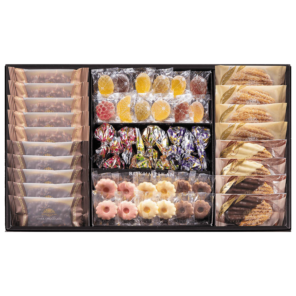 恵みのしずく(ブルーベリー、いちご、クランベリー、オレンジ、レモン、マスカット、グレープ、メロン、パイン、りんご、マンゴー、ピーチ)、ローズパレット(赤・黄・紫×各3)、リーフパイ(プレーン×4、ミルク・ホワイト×各2)、アーモンドショコラサブレ(ダーク・ミルク)×各5、フラワーサブレ(プレーン・いちご・ココア)×各4