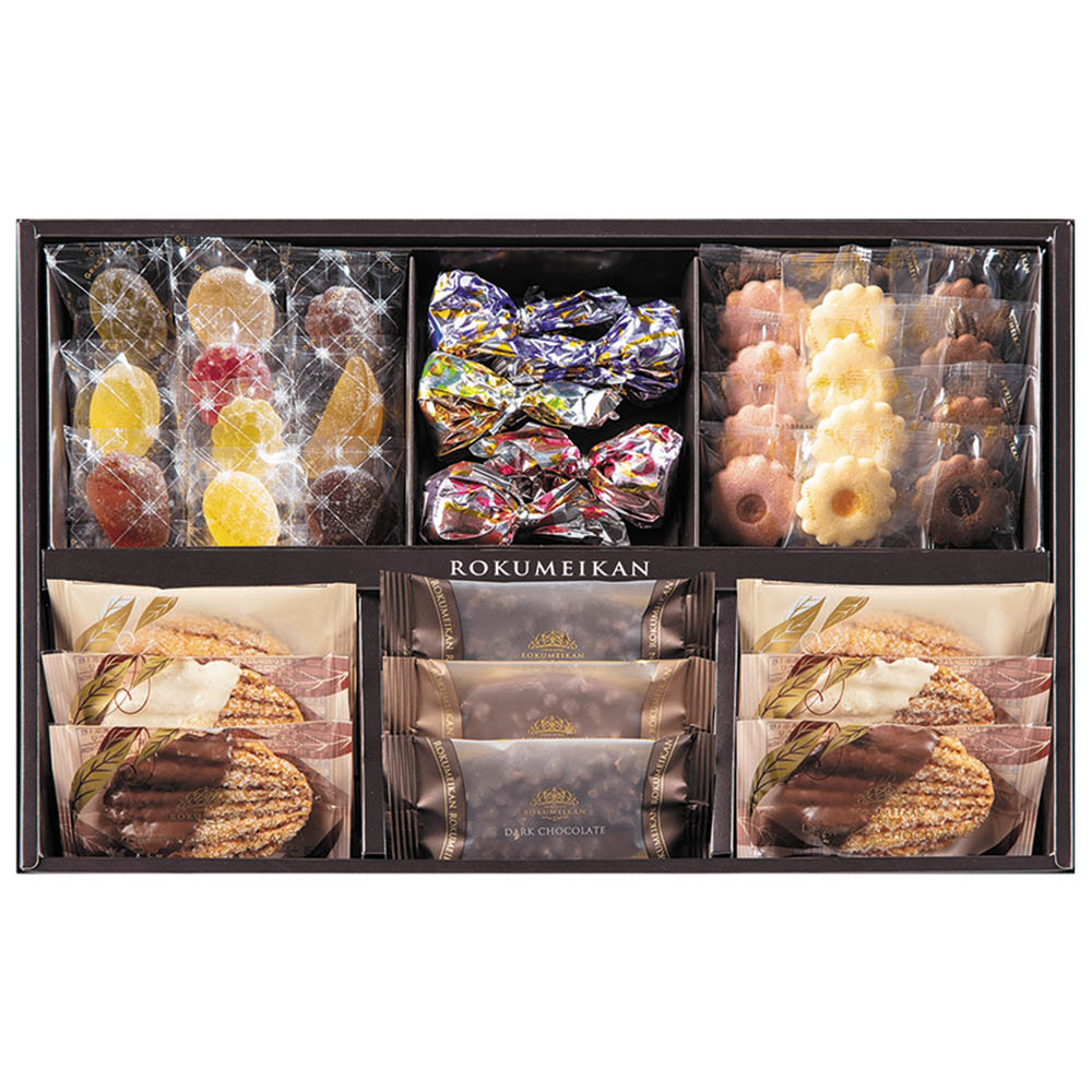 恵みのしずく(ブルーベリー、いちご、クランベリー、オレンジ、レモン、マスカット、グレープ、メロン、パイン、りんご)、ローズパレット(赤・紫×各2、黄)、リーフパイ(プレーン・ミルク・ホワイト)×各2、アーモンドショコラサブレ(ダーク×2、ミルク)、フラワーサブレ(プレーン・いちご・ココア)×各4