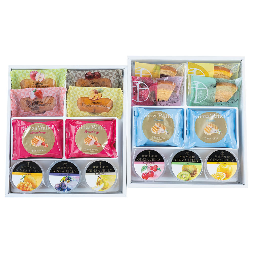 銀座ゼリー(ラ フランス、マンゴー、キウイ、グレープフルーツ、ブルーベリー、さくらんぼ)、銀座フルーツフィナンシェ(ストロベリー、パイナップル、アップル、マロン)、銀座ヴァッフェル(バニラ・いちご)×各4、銀座フルーツクーヘン(イチゴ&ミルク、レモン&はちみつ、メロン&ミルク、バナナ&チョコ)
