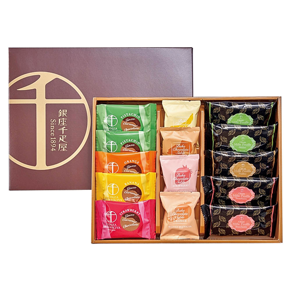 銀座ミルフィーユ(メロン・ストロベリー×各2、プラリネ)、銀座焼きショコラサブレ(オレンジ、ストロベリー、バナナ、キャラメル)、銀座キャラメルショコラ (ピスタチオ×2、ストロベリー、バナナ、オレンジ)