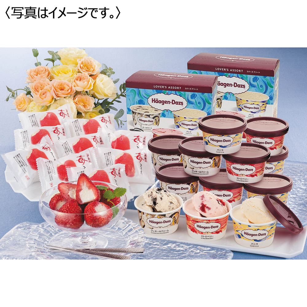 ハーゲンダッツラバーズアソート(バニラ・クッキー&クリーム・ストロベリー 各70ml×2)×2、苺アイス(約20g)×9