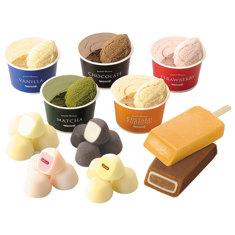 カップアイス(バニラ・ストロベリー・チョコレート・宇治抹茶・カスタードプリン)、グラスオショコラ(バニラ・ヨーグルト風味・カスタードプリン・ストロベリー×各4)、アイスバー(コーヒー・マンゴー)