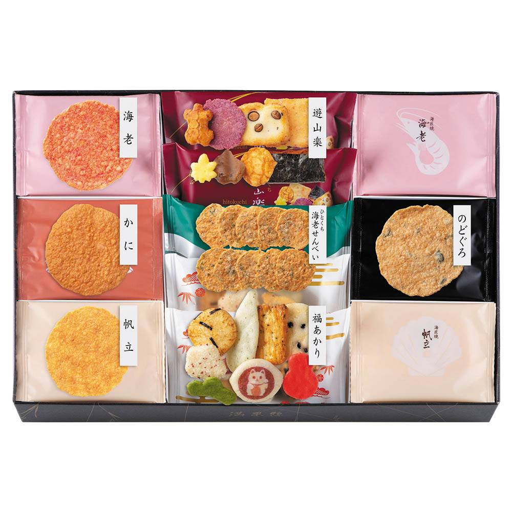 海匠焼(海老・帆立×各8、かに・のどぐろ×各4)、遊山楽・ふきよせ福あかり×各2、ひとくち海老せんべい