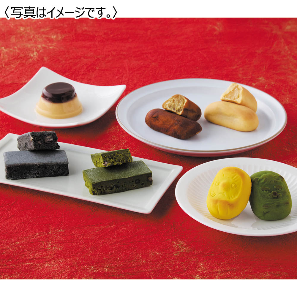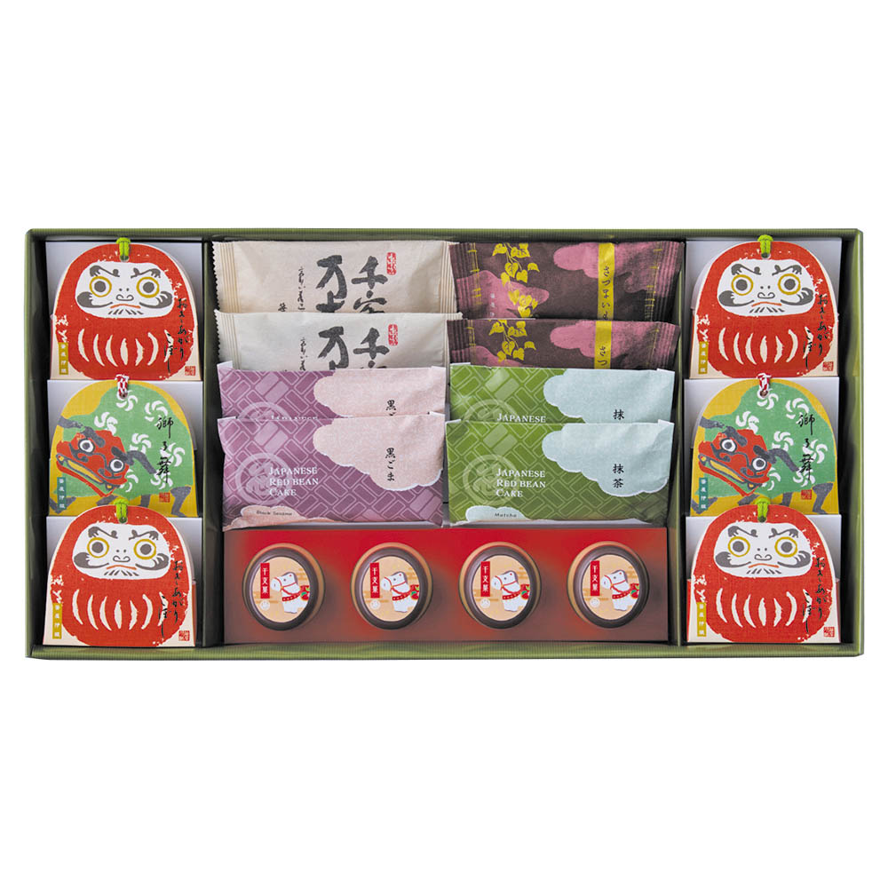Japanese Red Bean Cake(抹茶・黒ごま)×各2、千客万来・さつまいも・獅子舞×各2、おきあがりこぼし・干支菓(午)×各4