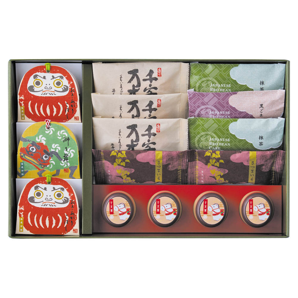 Japanese Red Bean Cake(抹茶×2、黒ごま)、千客万来×3、さつまいも×2、おきあがりこぼし×2、干支菓(午)×4、獅子舞