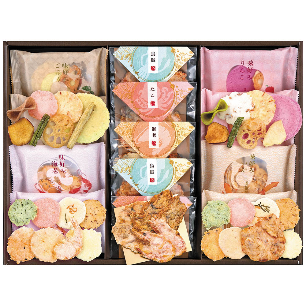 海の幸(海老・いか)・山の幸(りんご・ごぼう)・たこ唐揚げ・烏賊姿焼き×各2、海老姿焼き