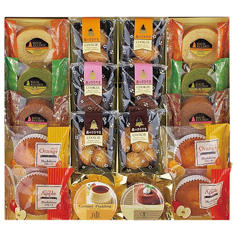 バームクーヘン(バニラ・抹茶・ココア)×各2、 クッキー(バニラ×4、ココア×2)、マドレーヌ(オレンジ・アップル×各2)、カスタードプリン、チョコレートプリン