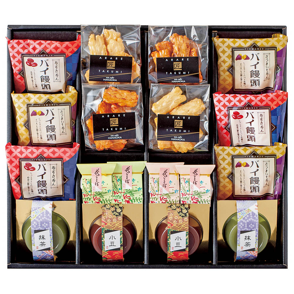 パイ饅頭(小豆・さつまいも)×各3、羊羹(小豆・抹茶)×各2、一口羊羹(小豆・梅)×各2、あられ(旨塩・香ばし醤油)×各2